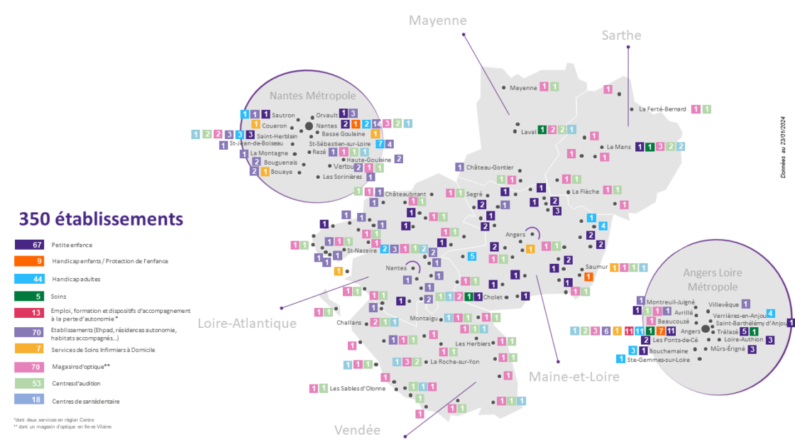 Le réseau de santé de VYV3 Pays de la Loire est vaste. Composé de 350 établissements et services, il couvre l’ensemble du territoire régional, en ville et dans les zones rurales. Grâce à ce maillage important, VYV3 Pays de la Loire, est un acteur mutualiste de proximité qui apporte des réponses adaptées à tous les âges de la vie.